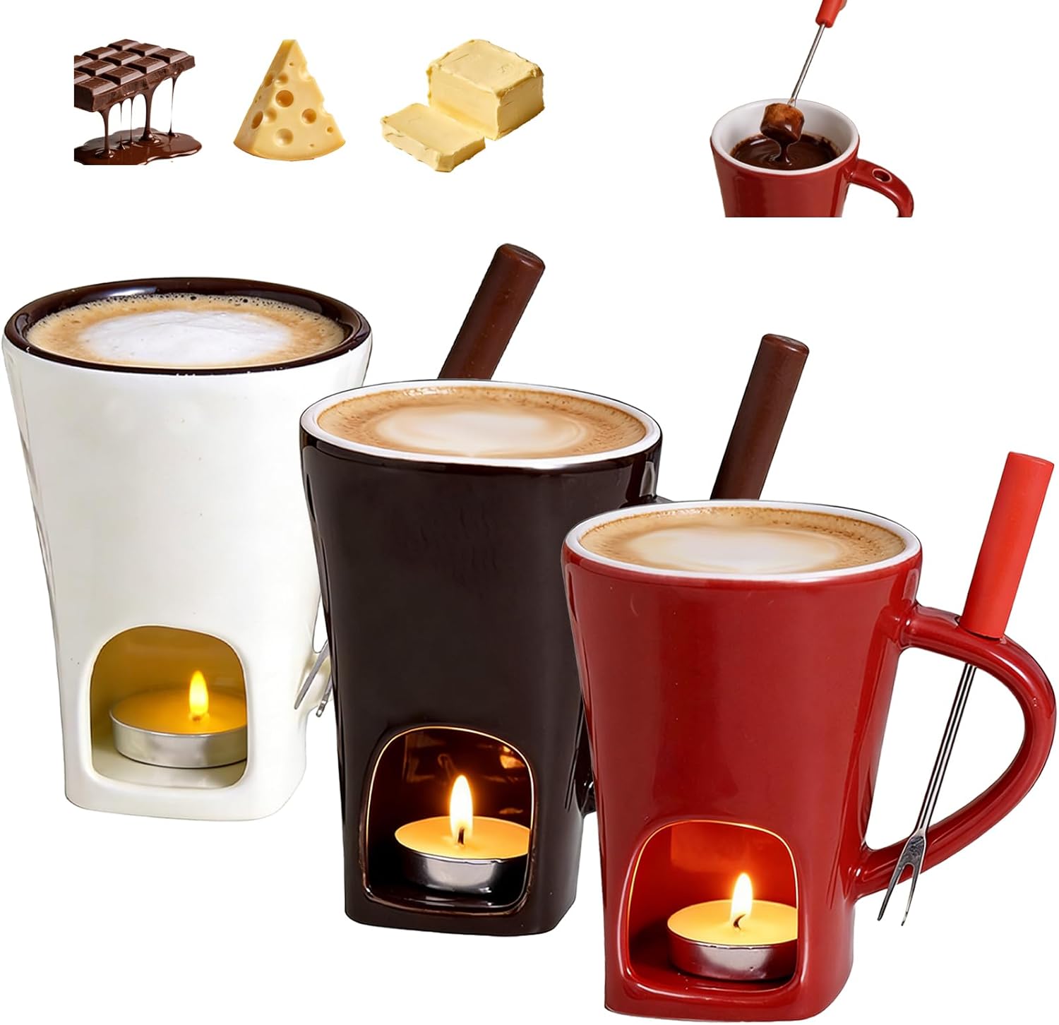 Chocolate Fondue Set, Ceramic Sweet Fondue Mug With Fork,Mini Ceramic Multifunction Pot Hot,Butter Warmer Set, Hot Pot Me lting Tea Light Heating, Date Night Birthday Wedding Gifts Specification: Name: Fondue Mug Weight: 400g Capacity: 130ml / 4.4oz Color: White, Brown, Red Material: Ceramic Product size: 11x8.3cm/ 4.33x3.27inch Heating Method: Microwave / Tealight Candle Applicable Ingredients: Chocolate, cheese, butter, caramel, etc. Package Includes: 1/2/3 x Ceramic Chocolate Fondue Mug 1/2/3 x Fork 1/2/3 x Candle Note: Colors may vary slightly due to monitor differences. This beautifully packaged fondue set makes a perfect gift for any occasion, whether for family, friends, or yourself.