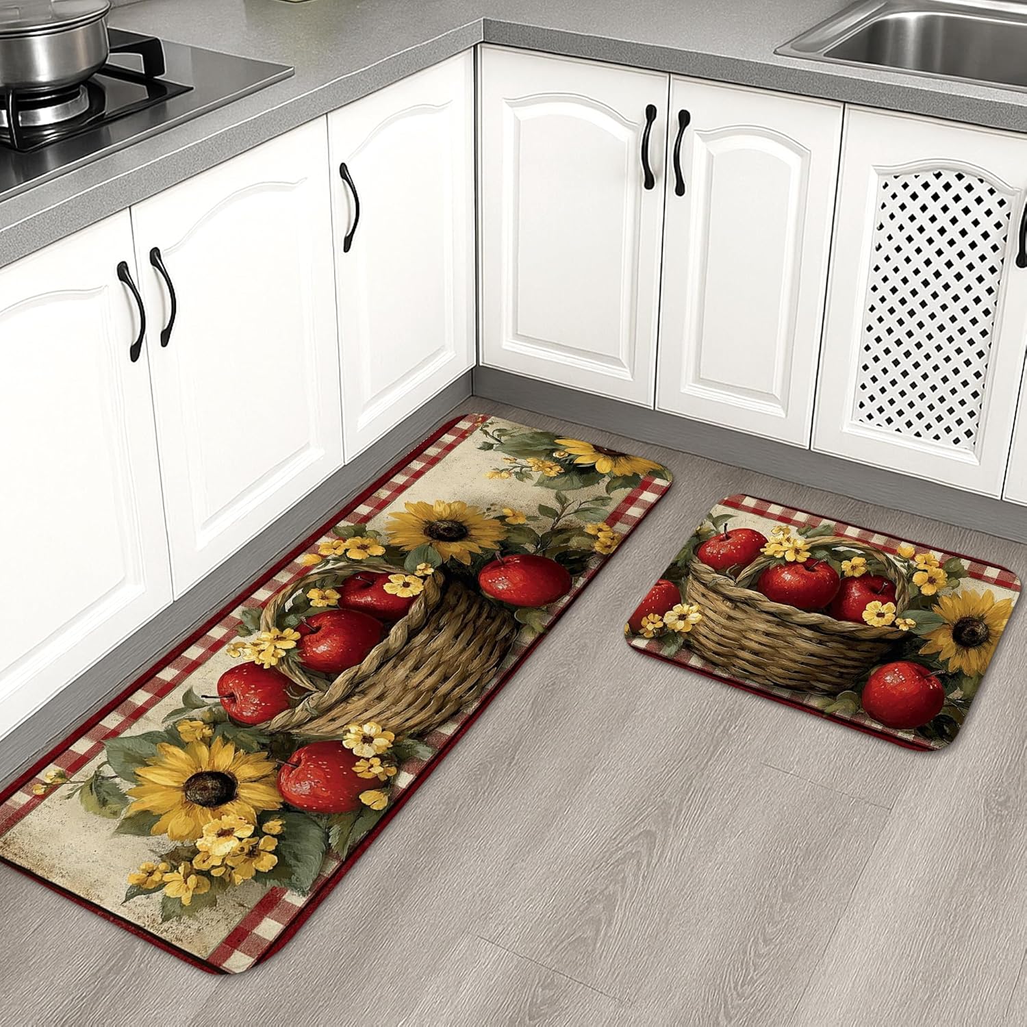 Fruit Kitchen Mats for Floor, Rustic Farmhouse Red Apples and Sunflowers Soft Mats, Cushioned Comfort Washable Non Slip Decor Rugs For Kitchen Sinks Laundryroom Bathroom