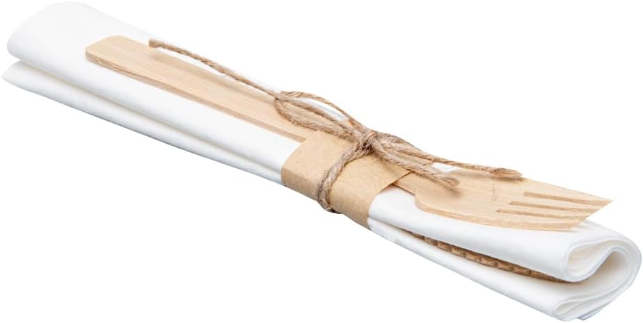 Include all the essentials in your customers' delivery orders using our Bambuddha Natural Bamboo Fork/Knife Sets. These bamboo utensils conveniently include a fork, knife, and white napkin to provide guests with everything they need to enjoy their delicious meals. Made from high-quality bamboo, these utensil sets sustainable and recyclable, ideal for meeting the eco-friendly standards of your restaurant or cafe. Beautifully held together by a string of twine, these disposable utensils add rustic elegance to your packed lunches or other takeout orders. These durable bamboo utensils have sharp edges and are break-resistant to quickly cut through foods without falling apart. Measuring 6.8 inches in length by 3.3 inches in width and 0.8 inches in height, these disposable utensils are available in a 100 count box.